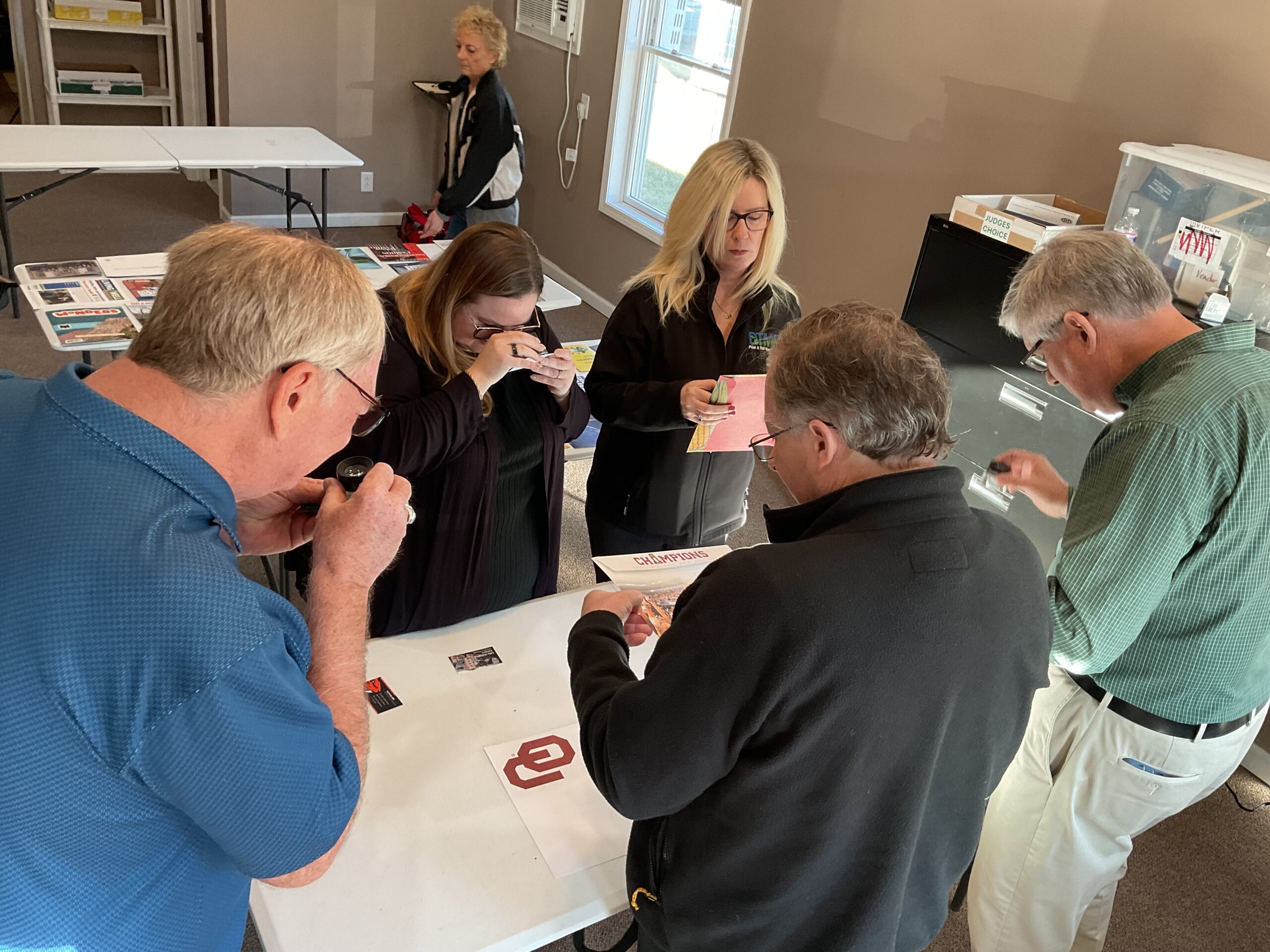 At the 2023 In-Print contest judging, Mike Barnes, Bobbi Francis, Forrest McGuire, Larry Clements, and Nate Riggins examine entries.