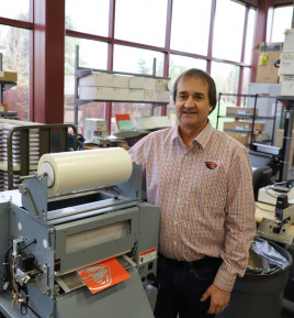 At Oregon State University, Mike Varner shows off the in-plant’s Duplo DFL-500, which handles foiling, dry coating, and laminating printed pieces. | Credit: Oregon State University