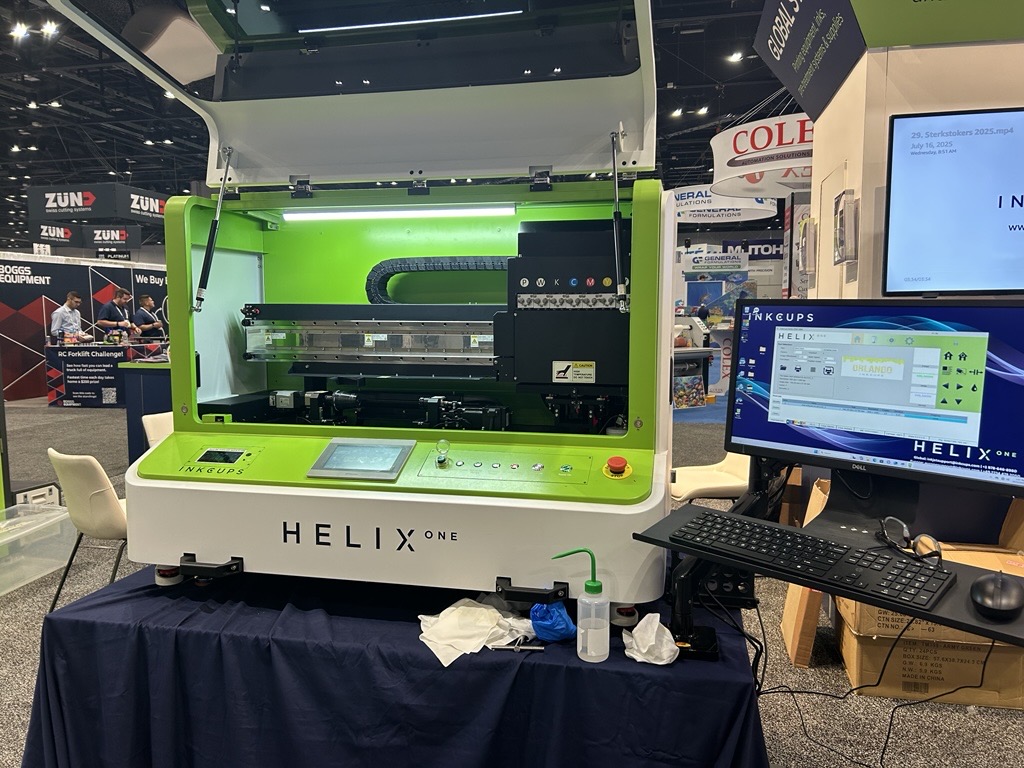 Inkcups (Booth 1530) introduced updates to its Helix ONE cylindrical direct-to-object printer, including Auto File for streamlined file management, barcode scanning, a jettable primer for powder-coated products, and expanded diameter capability ranging from 33mm to 116mm.