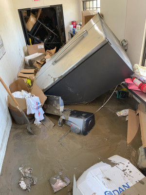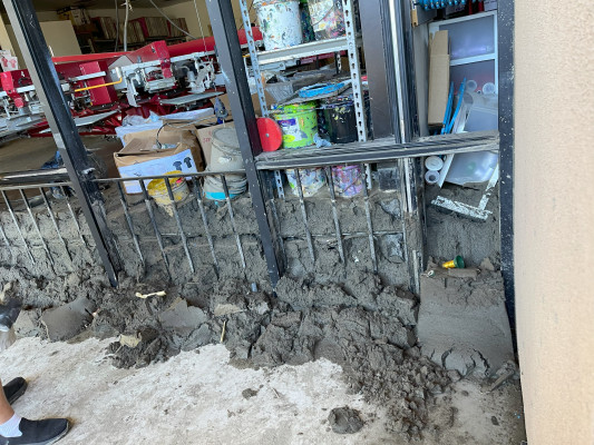 The mud came in during the night, amid the torrential rains of Hurricane Hilary, which brought flooding to Cathedral City, California. On August 20th, up to four feet deep in places, mud washed across the parking lot of Desert Promotions, a producer of vinyl graphics, wraps, decorated apparel, and other items, and entered the building, breaking doors and windows, buckling walls, and burying everything inside.