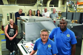 John D.L. Johnson (front and center) and his staff (before social distancing) at Palm beach county’s Graphics Division pose with their Presstek 52DI digital offset press.