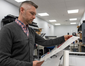 Radford University Printing and Postal Services Manager Jonathan Mayer checks a proof printed on the in-plant’s Oki C942.