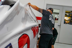 “It takes about six to eight man hours to wrap a car, and we work in two-man teams, so around a four-hour window, although depending on the car it can fluctuate,” says Woodward, such as if extra stripes, metallic, or neon features are added. “The cars are being put together at the same time and have to be done to go to the track with the wrap. We can’t have the car for two to three days — we have four hours, and they’re doing 10 other things to the car while you’re wrapping. That happens a lot.”