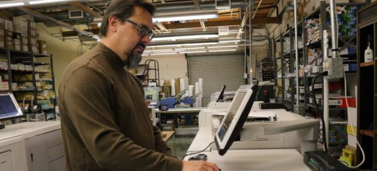 Gordon Rivera, supervisor at Allan Hancock College Campus Graphics, calibrates his in-plant’s Canon imagePRESS C800 to G7 grayscale compliance using PRISMAsync software.