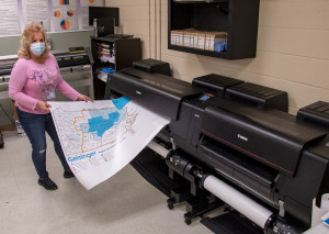 Graphic Designer Diane Latranyi retrieves a Geisinger services area map from the Canon imagePROGRAF PRO-4000 wide-format printer, which shares the space with a Canon imagePROGRAF PRO-2000 and a Graphtec plotter/cutter.