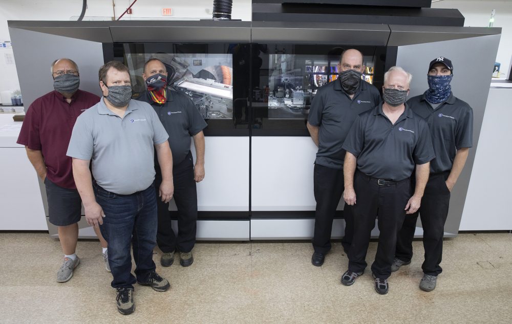 Staff members of Penn State Health Printing Services stand in front of the in-plant’s new Canon varioPRINT iX-series sheetfed inkjet press. From left: Tom Bender, Craig Seybert, Mike Saich, Kevin Rosborough, Glenn Crowther, and Ryan Wamsher.