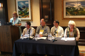 At a past IPMA conference, Elisha Kasinskas (Rochester Software Associates) moderates a panel discussion in which managers shared some of their innovative ideas. From left: John Cruser (Bloomberg), Doug Larsen (Boys Town), Robbie Feazel (Federal Home Loan Bank Atlanta) and Chelle Palmer (Richland School District).