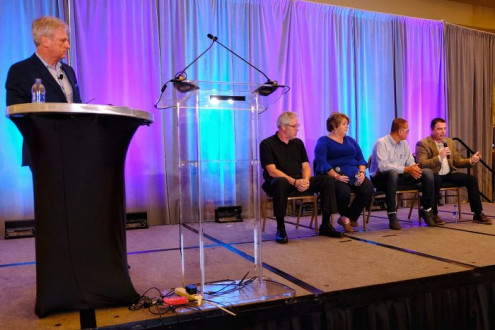 Joe Morgan moderates a panel discussion featuring (from left) John Sarantakos, Tammy Golden, Greg Cholmondeley and John Cruser.