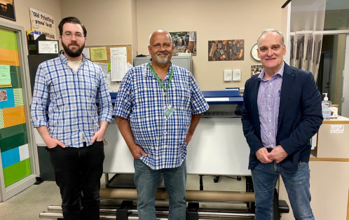 From left: Cody Watson, Chris Joakim, and Cameron Roy stand with the University of the Fraser Valley’s Epson SureColor S40600.