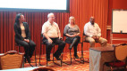 At Omaha Public Schools, Lead Artist Shelly Dutiel (foreground) runs a banner on the Mutoh VJ1638 printer, while Plant Specialist Janet Hula, Manager Steve Priesman and IT Technician Jeff Wild look on.