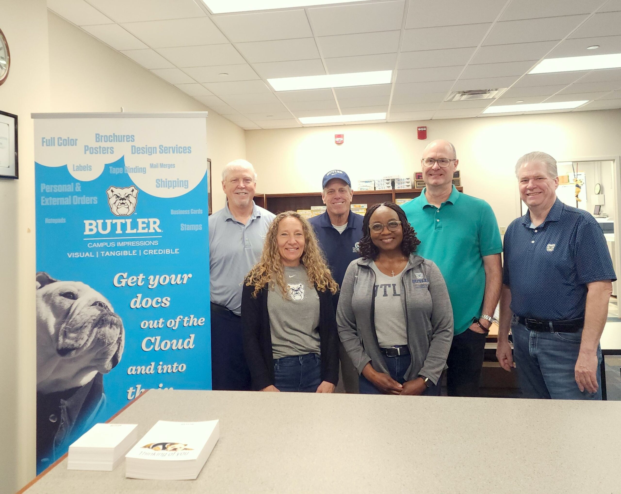 The staff of Butler University Print, Copy and Mail Services. From left: Chris Davis, Denise Royal, Greg Dycus, Elaine Andry, Nathan Clement, and Rory Haden.