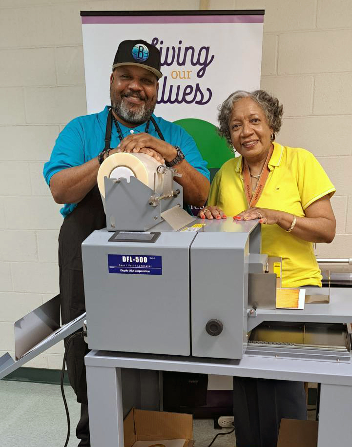 Press Operators Tyrone Tyler and Andrea Bassett stand with the Duplo DFL-500 dry coat/foil/laminator.