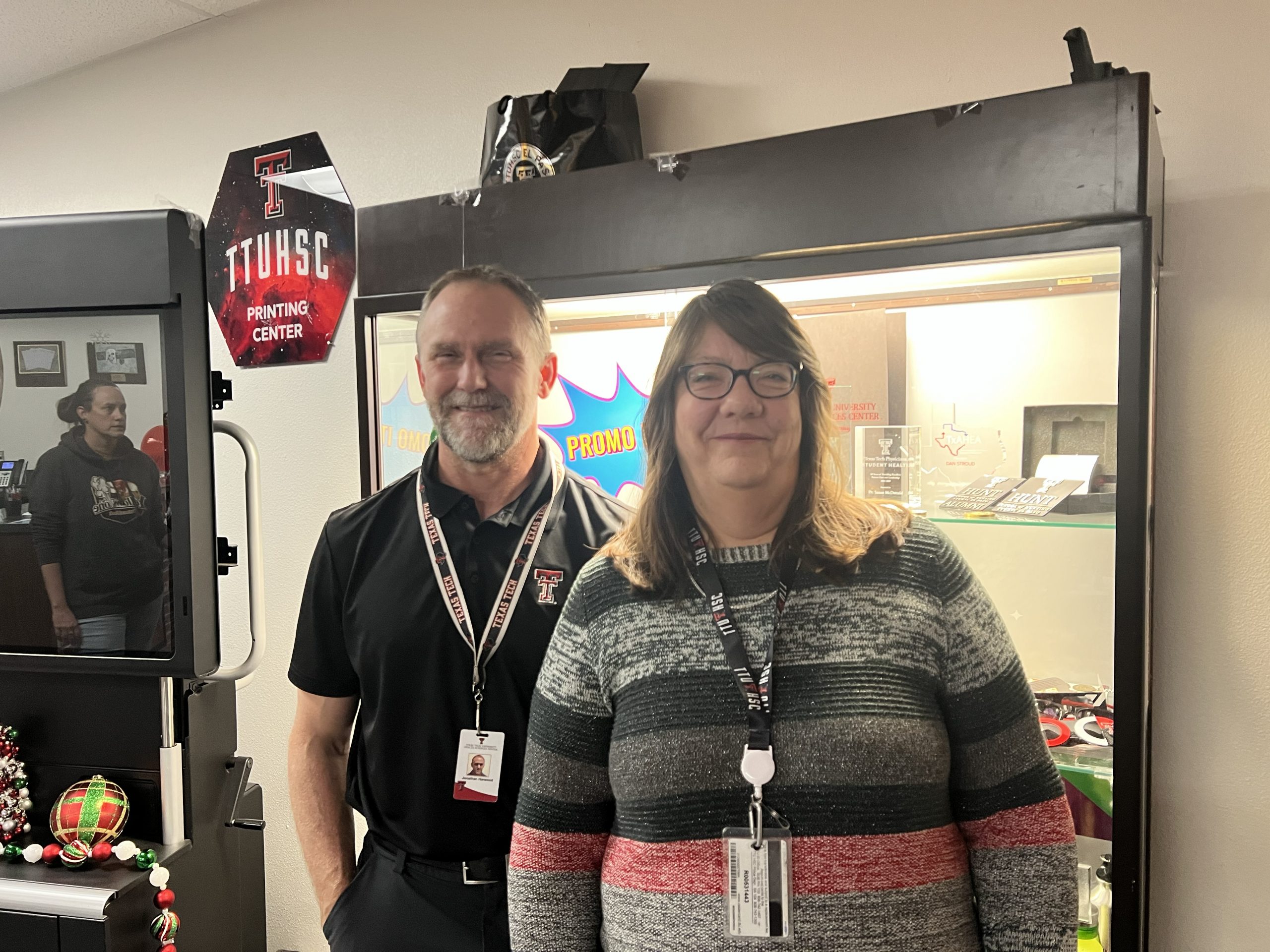 Jon Harwood and Debbie Cate stand in front of a promo products display case in the lobby of the TTUHSC Printing Center.