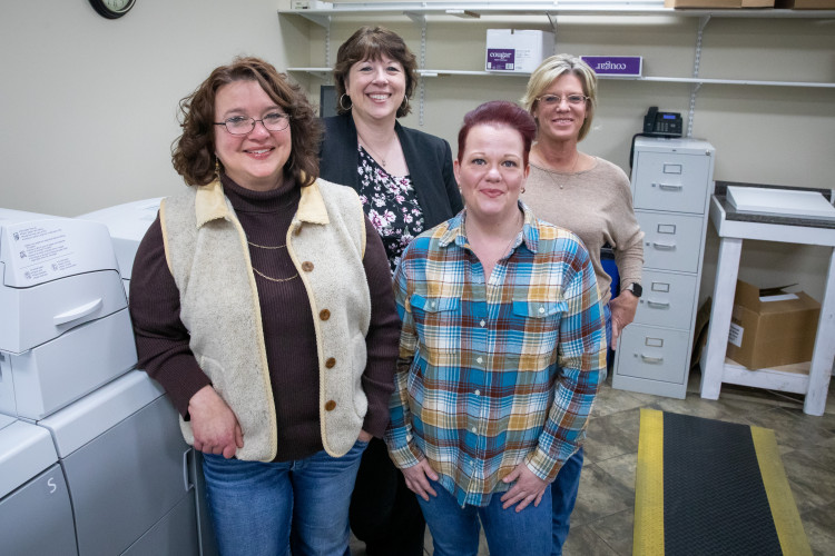 The women who run Cedarville University Print Services (from left): JennyBeth Freeman, digital prepress technician/operator; Magalie Chapman, digital press operator; Tammy Slone, director of retail services; Jessica Seiter, senior digital press operator/production coordinator; and Anna Vander Brink, student employee.