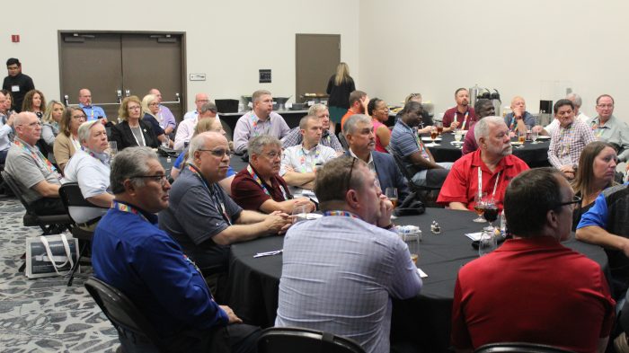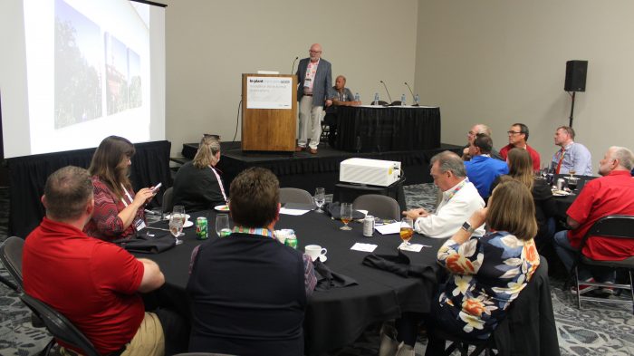 Mike George (standing) and Roy Nance addressed a packed room of in-plant managers.