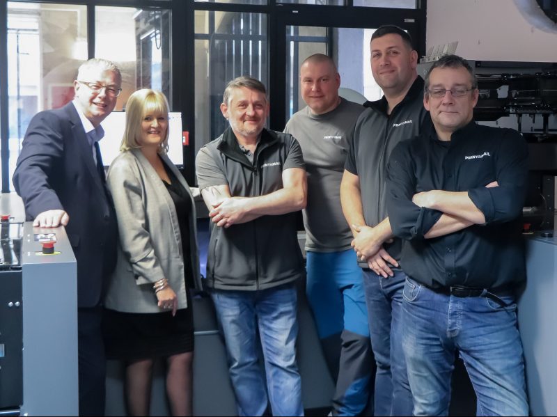 The University of Leeds Print and Mail Service team members and visiting vendors stand with some of the in-plant’s equipment. From left: Paul Dexter, Wendy Hogg, Scott Fleming, Lee Mchugh, Mark Phillips, and Ollie Renshaw.