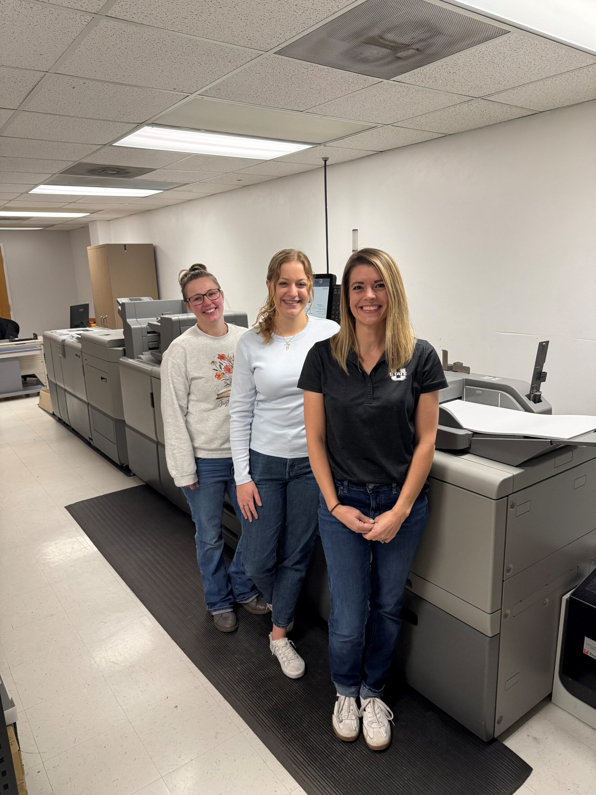 From left: Lacey Lee, Heather Lyman, and Annie Christensen stand with Aggie Print and Mail’s Ricoh Pro C7210SX.