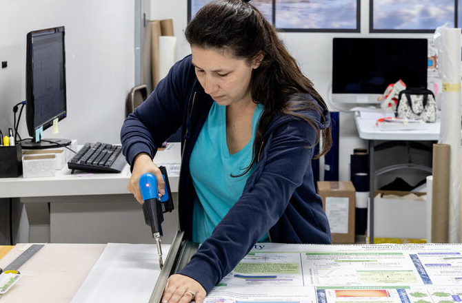 Sara Cardinal, large format specialist at Yale Printing & Publishing Services, trims a poster printed on fabric made from recycled plastic bottles. Photo by Robert DeSanto