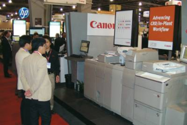 Xerox wowed visitors as soon as they stepped onto the show floor with its new Xerox Color 1000 press. Crowds milled around the new digital press throughout the show. With a smaller footprint than an iGen4, and standing about 6 feet in height, the color press seems targeted at space-strapped in-plants. The Xerox Color 1000 prints 100 pages per minute (there is also an 80-ppm version, the Color 800) at 2,400x2,400 dpi. A new clear dry ink station allows images and text to be highlighted for visual impact. It can print on a range of papers, up to 350 gsm.